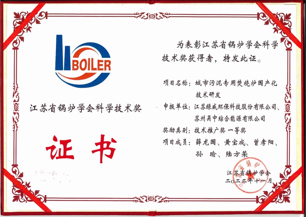 近日,2022年江蘇省鍋爐學(xué)會“科學(xué)技術(shù)獎”評審結(jié)果公示,潤邦股份旗下綠威環(huán)保與蘇州吳中綜合能源有限公司聯(lián)合申報的“城市污泥專用焚燒爐國產(chǎn)化技術(shù)研發(fā)”榮獲技術(shù)推廣獎一等獎。“城市污泥專用焚燒爐國產(chǎn)化技術(shù)研發(fā)”是綠威環(huán)保自主研發(fā)的科研項目,已獲得多項專利授權(quán)。
