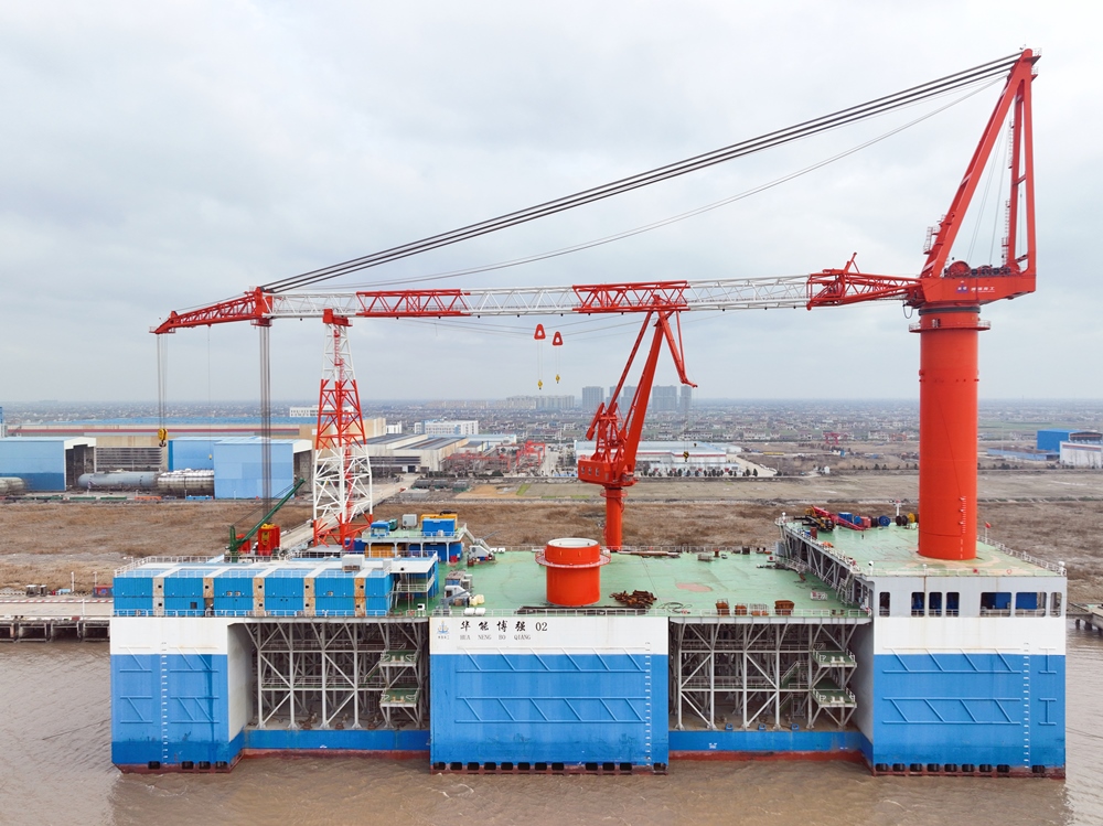 該海洋起重機安裝于“華能博強02”號風電安裝船,最大起重量可達800噸,最大起升高度達205米,具有自重輕、起重能力強、操作靈活、滿負荷時仍可實現回轉作業等特點,可用于滿足15MW以下風機吊裝作業需求。