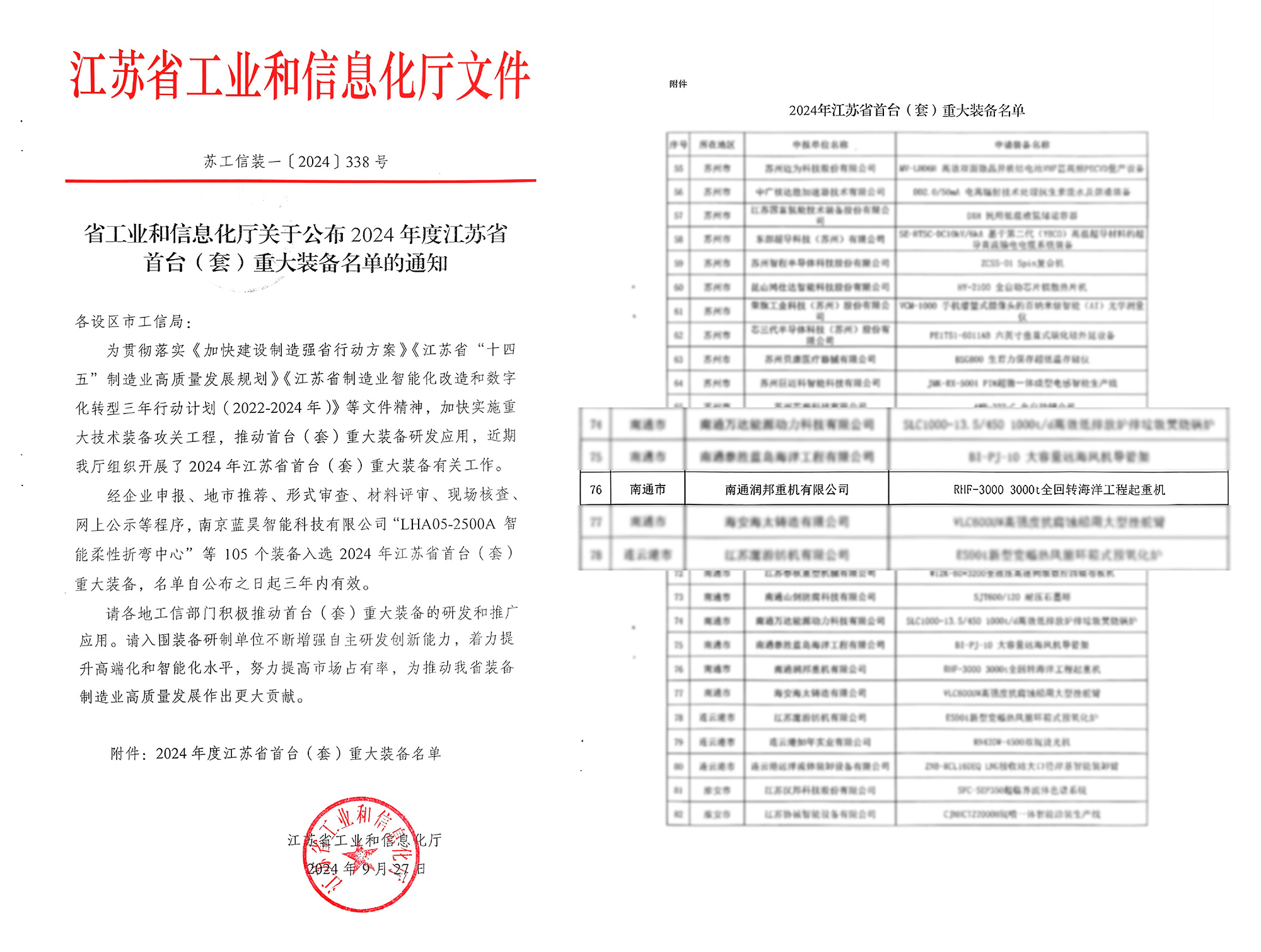 近日,江蘇省工業(yè)和信息化廳正式公布了2024年度江蘇省首臺(tái)(套)重大裝備名單,其中,子公司南通潤(rùn)邦重機(jī)有限公司自主研發(fā)建造的GENMA 3000噸全回轉(zhuǎn)海洋起重機(jī)成功入選,標(biāo)志著該裝備在技術(shù)創(chuàng)新和高端制造方面取得了重要突破。
