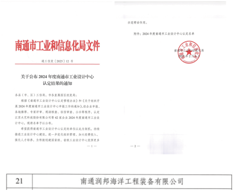近日,南通市工業(yè)和信息化局公布2024年度南通市工業(yè)設計中心認定結(jié)果的名單,子公司潤邦海洋經(jīng)過專家評審、現(xiàn)場核查、征信審查等程序,最終被認定為2024年度南通市工業(yè)設計中心。此次設計中心的認定是對潤邦海洋創(chuàng)新能力、設計水平及服務能力的認可。