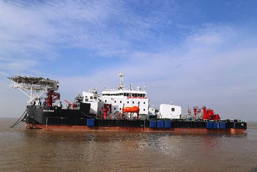 在項目組全體人員的不懈努力下,4000噸自航重吊船圓滿交付離港。該船長108米、型寬48.4米、型深8米,主要服務于歐洲市場的海上重吊作業和風電場的安裝、維護作業,入級英國勞氏船級社。