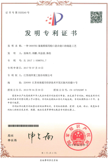 近期,公司獲得了由國家知識產權局授權的《一種3600TEU集裝箱船用艙口蓋合攏口的制造工藝》發明專利證書,標志著公司在集裝箱船用艙口蓋領域取得了新的技術突破。