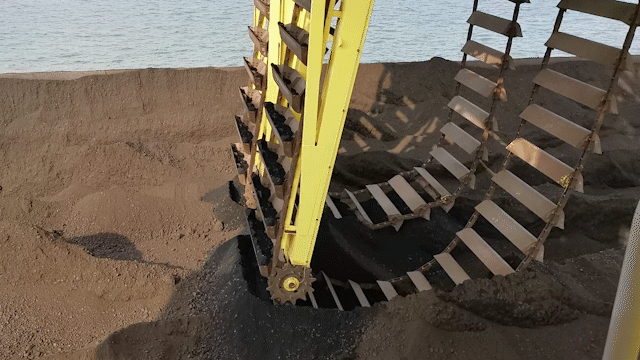 GENMA懸鏈斗卸船機設計效率為2x800t/h,采用多排鏈控制,具有靈活高效和卸船穩(wěn)定等特點。GENMA懸鏈斗卸船機對水面風浪敏感度低,駁船因風浪上下顛簸時,卸船機取料部分不會因為與船艙碰撞而損壞,提高了設備的環(huán)境適應能力。