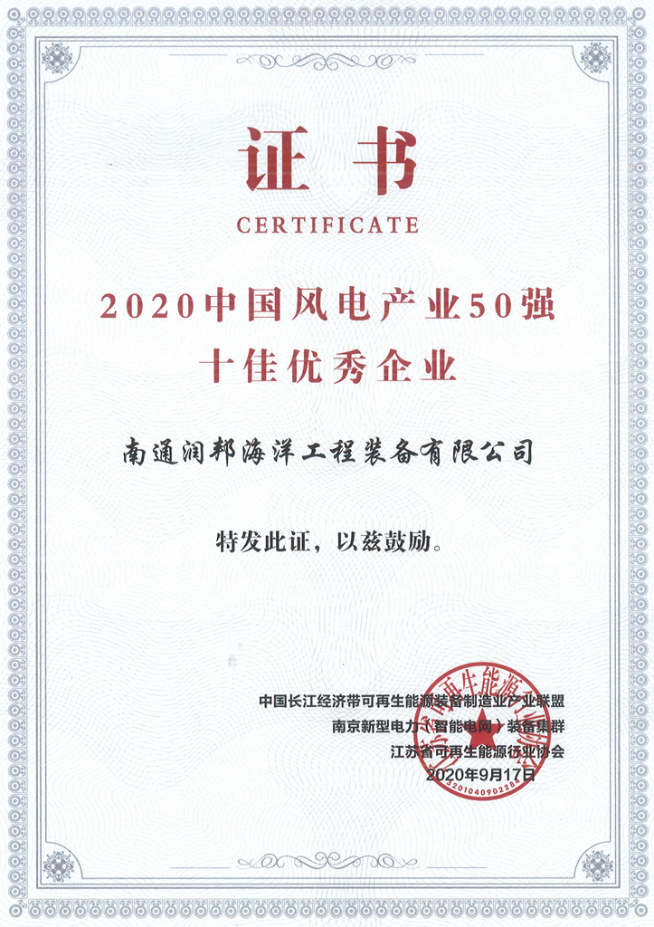 當(dāng)日,大會還舉辦了“2020中國風(fēng)電產(chǎn)業(yè)50強”頒獎典禮,潤邦海洋憑借穩(wěn)健的市場發(fā)展勢頭,在海上風(fēng)電領(lǐng)域日漸凸顯的品牌影響力,過硬的技術(shù)實力及卓越的產(chǎn)品質(zhì)量,榮獲“十佳優(yōu)秀企業(yè)”獎項,潤邦海洋執(zhí)行董事施曉越先生受邀出席頒獎典禮并代表公司上臺領(lǐng)獎。