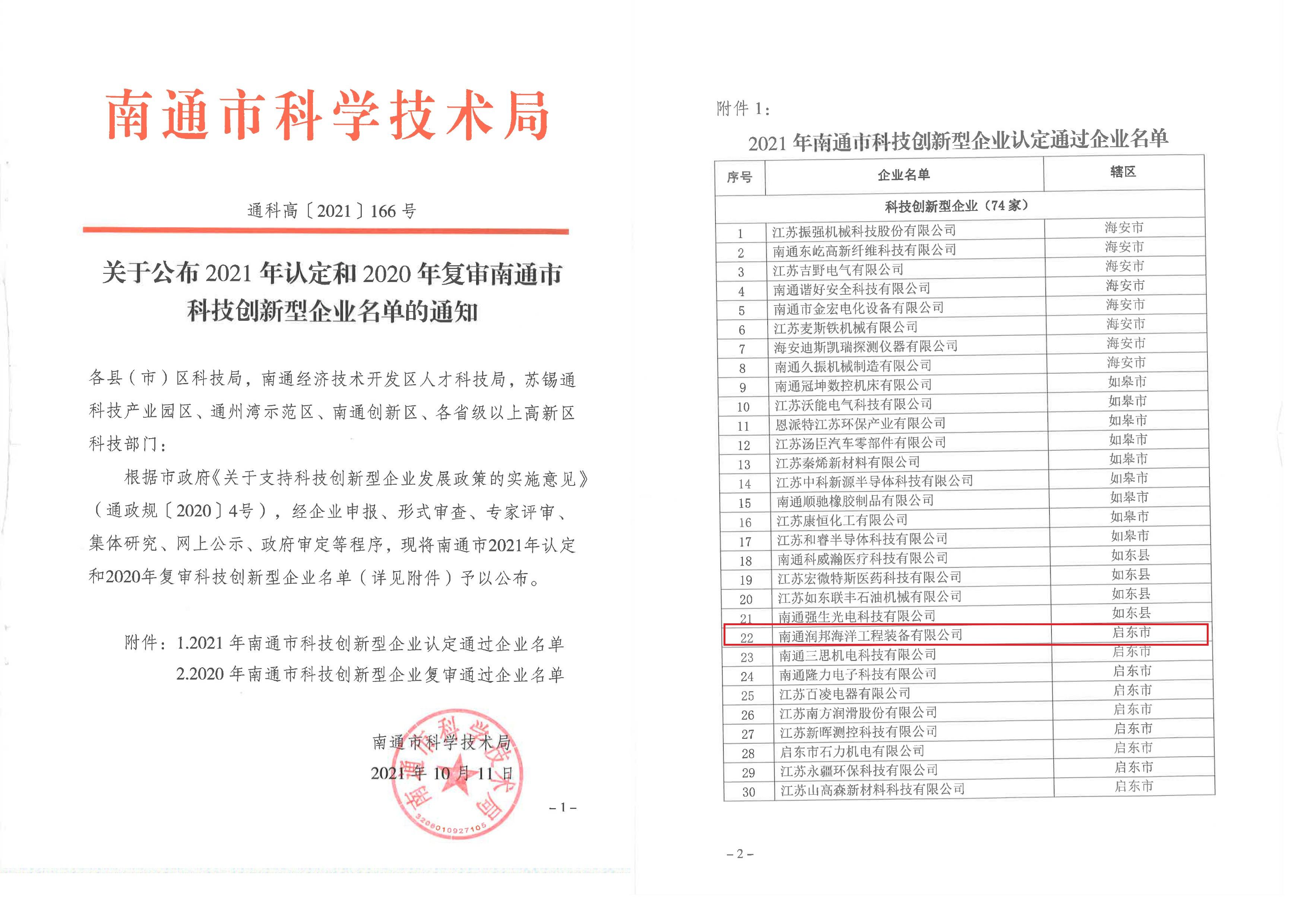 近日,南通市科學技術局發布了《關于公布2021年認定和2020年復審南通市科技創新型企業名單的通知》,子公司潤邦海洋榜上有名!榮獲“南通市科技創新型企業”榮譽稱號,這是潤邦海洋在“秉承創新的技術為顧客創造價值”的企業使命,不斷提...