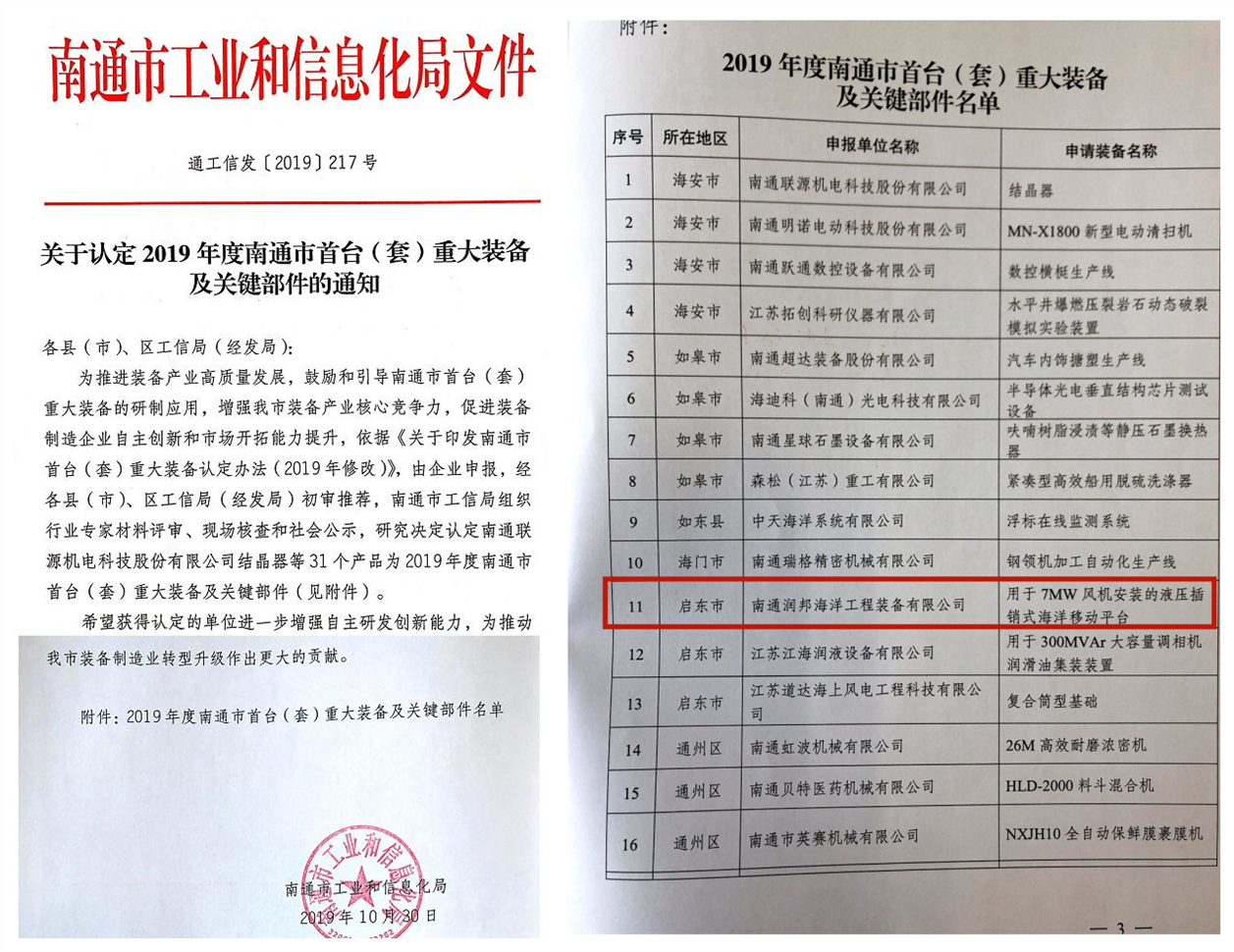 近日,由潤邦海洋申報的“用于7MW風機安裝的液壓插銷式海洋移動平臺”項目獲南通市2019年度首臺(套)重大裝備及關鍵部件認定。