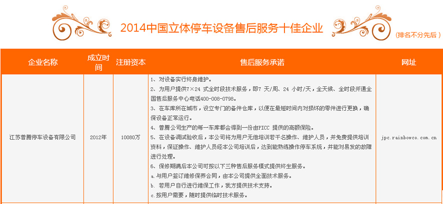 近日,子公司江蘇普騰獲得由中國采購與招標(biāo)網(wǎng)及中國名企排行網(wǎng)聯(lián)合評選出的“2014中國立體停車設(shè)備售后服務(wù)十佳企業(yè)”。