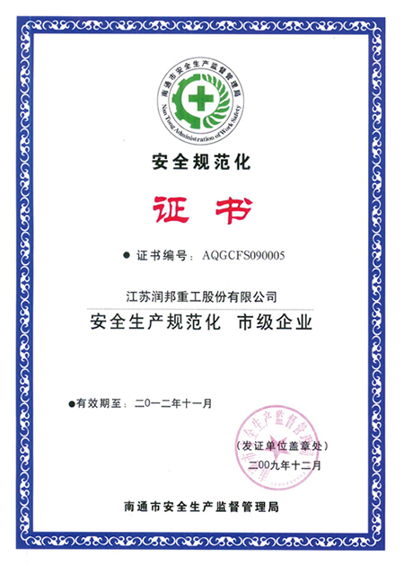 2011年7月13日,南京海關(guān)、南通海關(guān)在位于市區(qū)青年西路的海關(guān)大廈會議廳聯(lián)合舉辦了“南京海關(guān)AA類企業(yè)(南通)授牌儀式”,江蘇潤邦重工股份有限公司獲“AA類企業(yè)”授牌。