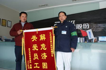 3月29日上午,一車(chē)間配料一組員工沈勇將一面寫(xiě)有“解危濟(jì)困 關(guān)愛(ài)員工”的錦旗送到工會(huì)主席陳南山手中,今年2月6日公司員工迎新晚會(huì)中,公司常務(wù)副總經(jīng)理孫建成、工會(huì)主席陳南山發(fā)動(dòng)公司全體員工為身患重病的員工沈勇捐款,幫助沈勇渡過(guò)難...
