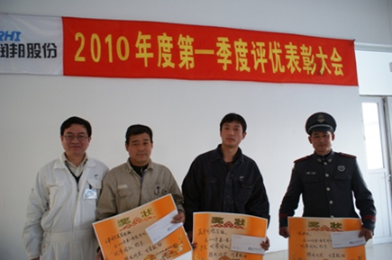 4月16日,潤(rùn)邦股份在培訓(xùn)三樓召開(kāi)公司2010年第一季度評(píng)優(yōu)表彰大會(huì),大會(huì)首先通過(guò)PPT模式向各位員工通報(bào)了公司第一階段安全形勢(shì)并由安全環(huán)境部部長(zhǎng)頒發(fā)了第一季度安全達(dá)標(biāo)團(tuán)隊(duì)及安全標(biāo)兵獎(jiǎng)項(xiàng)