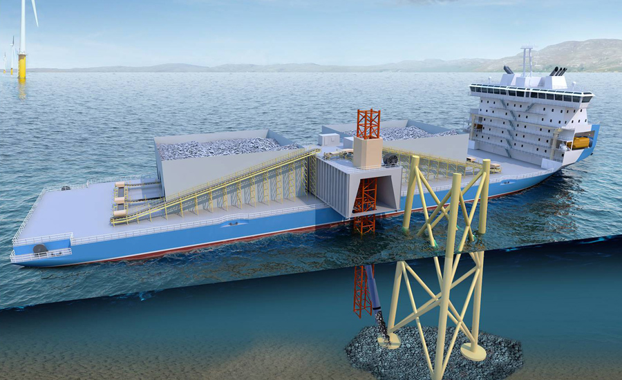 拋石船:精準(zhǔn)定位、自動(dòng)拋石,主要用于海上風(fēng)電基礎(chǔ)單樁及海纜的固樁、護(hù)纜拋石等作業(yè)。